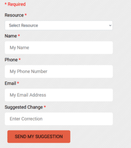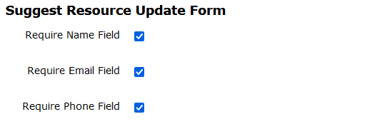 • Now you can allow a user to submit a resource change suggestion without needing to enter their Name, Phone, and/or Email. You have the ability to change the required fields in the ‘Suggest Resource Update' form to make it easier for users to submit information.